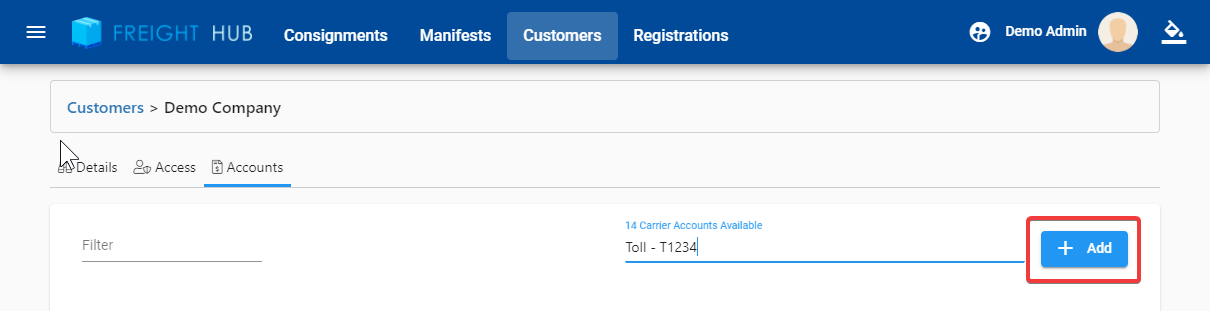 Before a Customer can create a Consignment, they must first be assigned at least 1 "Account" from a specific Carrier. Multiple Accounts can be added to every Customer, allowing them to choose the correct billing account for each Consignment they generate in the system. Please follow these instructions to add a Carrier Account to a Customer.