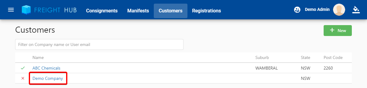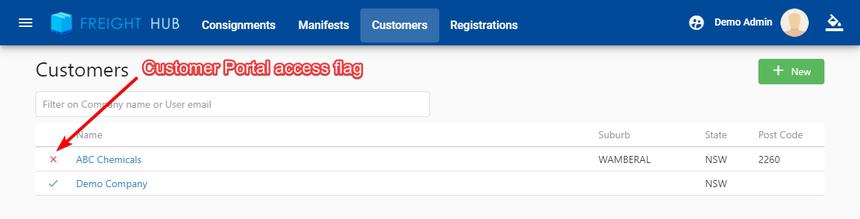 Customers that have been granted Portal access will appear in the Customer list with a green check mark next to them and those with a red check mark do not have any Portal access: