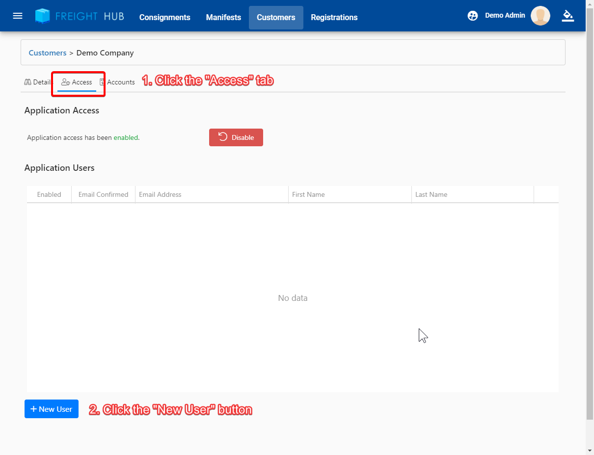 - Click on the "Access" tab and then Click the "New User" button at the bottom of the screen: