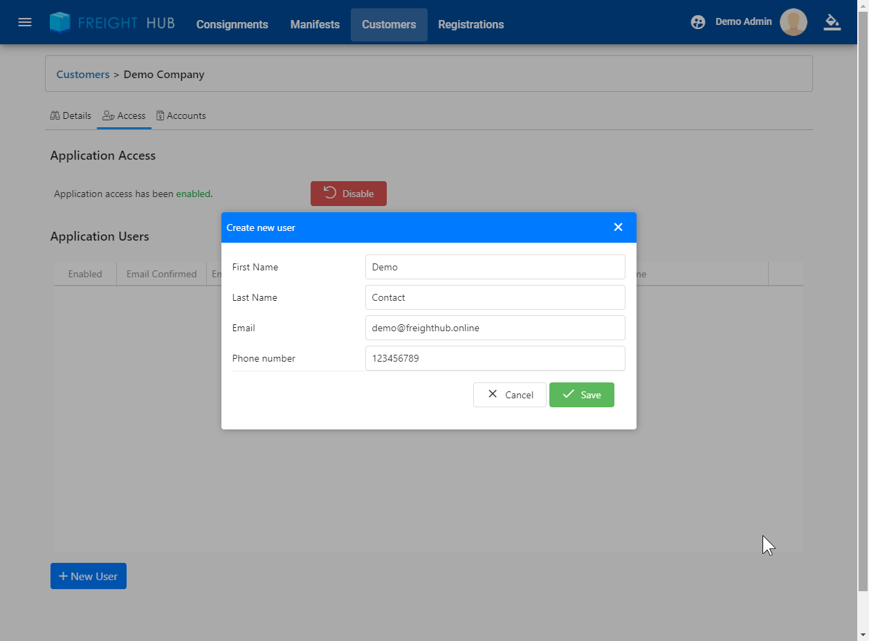 - Fill in the correct User details as necessary (the first user added will default to the Customer contact as below):