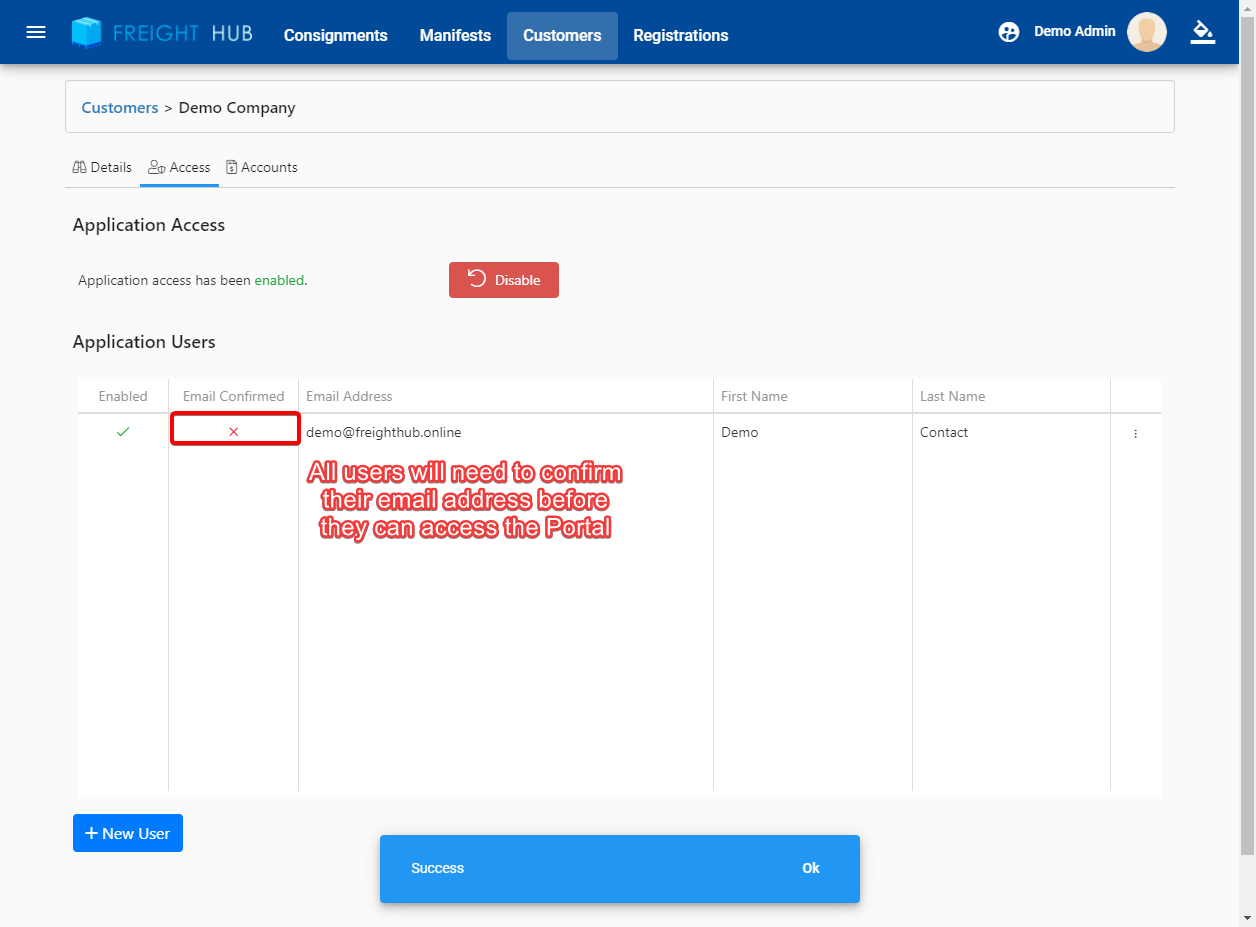 - The User will be added to the list and an invite is automatically sent with a request to verify their email address:
